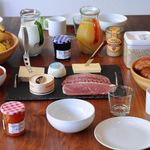 (Café Nespresso, Thé, Lait Chocolaté, Jus de fruits frais, Croissnt et Pain chauds, Toasts, Confiture Maison, Miel du Morvan, Fromages régionaux, Charcuterie de Pays, Céréales, Oeufs de la Ferme...).
