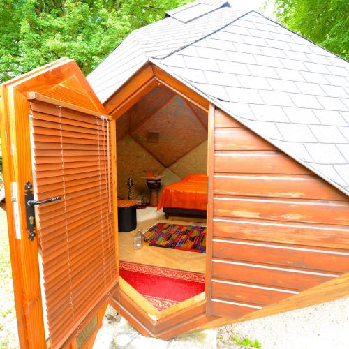 * 1 Zôme (1 à 2 personnes) aménagé en Nid d'Amour à l'abri d'un magnifique tilleul, avec un lit double et un toit donnant sur les étoiles. Cet endroit insolite est idéal pour les amoureux ou pour toute personne cherchant à se ressourcer. une Salle de Bain entièrement carrelée vous est réservée dans le chalet voisin.