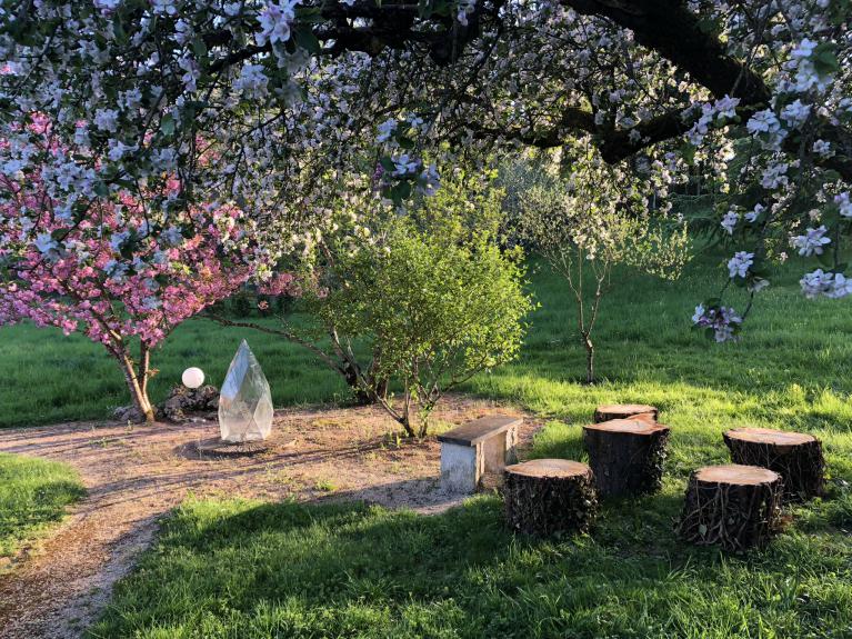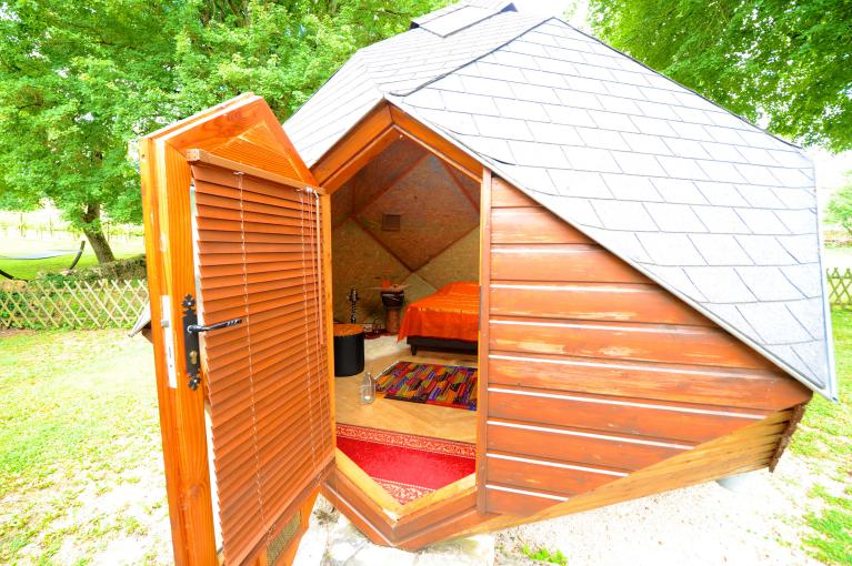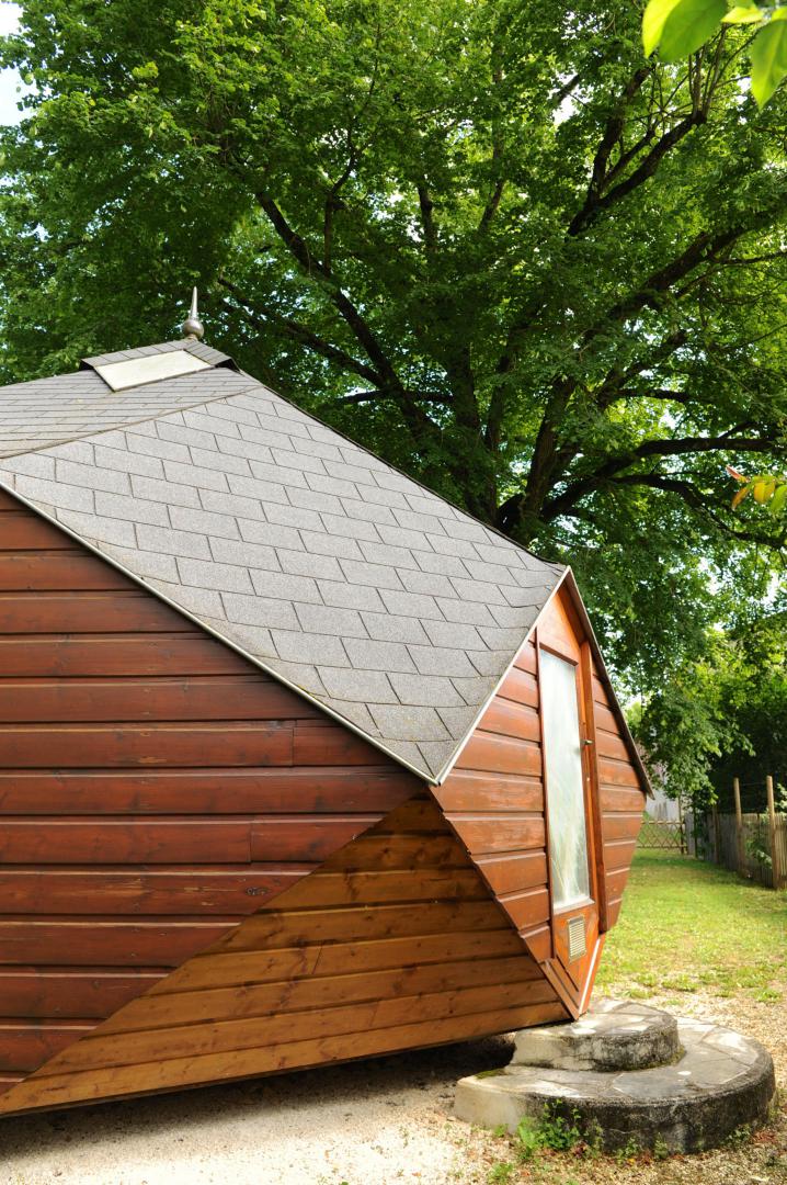 * 1 Zôme (1 à 2 personnes) aménagé en Nid d'Amour à l'abri d'un magnifique tilleul, avec un lit double et un toit donnant sur les étoiles. Cet endroit insolite est idéal pour les amoureux ou pour toute personne cherchant à se ressourcer. une Salle de Bain entièrement carrelée vous est réservée dans le chalet voisin.