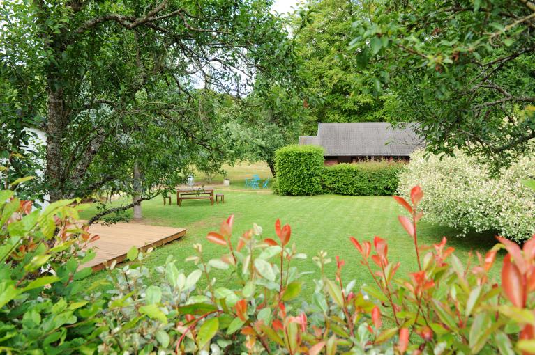 * 5000 M2 de jardins aménagés à votre disposition pour profiter du soleil ou de l'ombre... (Hamac, Vignes, Arbres Fruitiers, Potager, immense pelouse, Barbecue, Table et Chaises de jardin... )